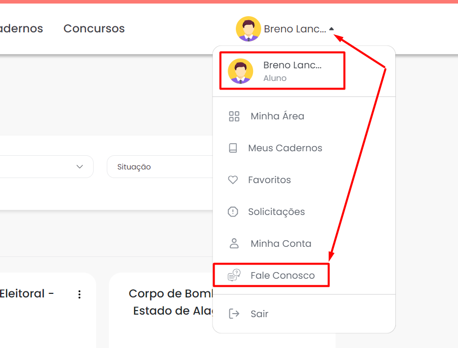 Na sua aba do lado superior direito vai clicar em cima do sue nome e ir em Fale Conosco.